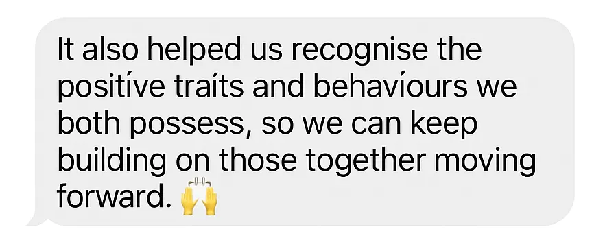 They have learnt how to create safety in their relationship allowing Beck to feel safe when communicating. They now have the tools to resolve conflict quickly and easily.