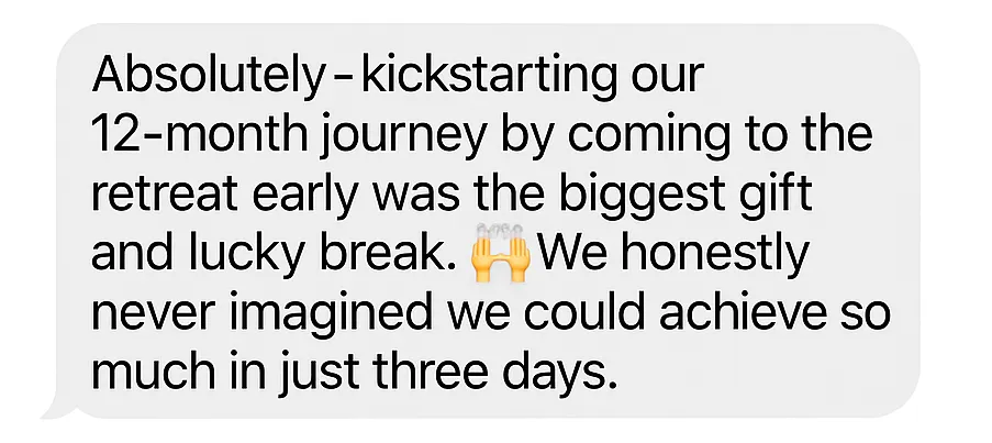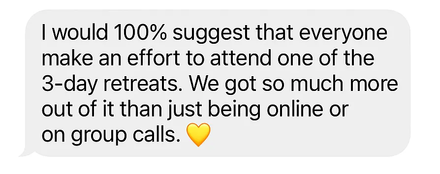 A key part of the program is our transformative 3-day retreat, where you'll dive deep into the work, strengthen your connection with your partner, and accelerate your progress in a powerful, in-person setting.